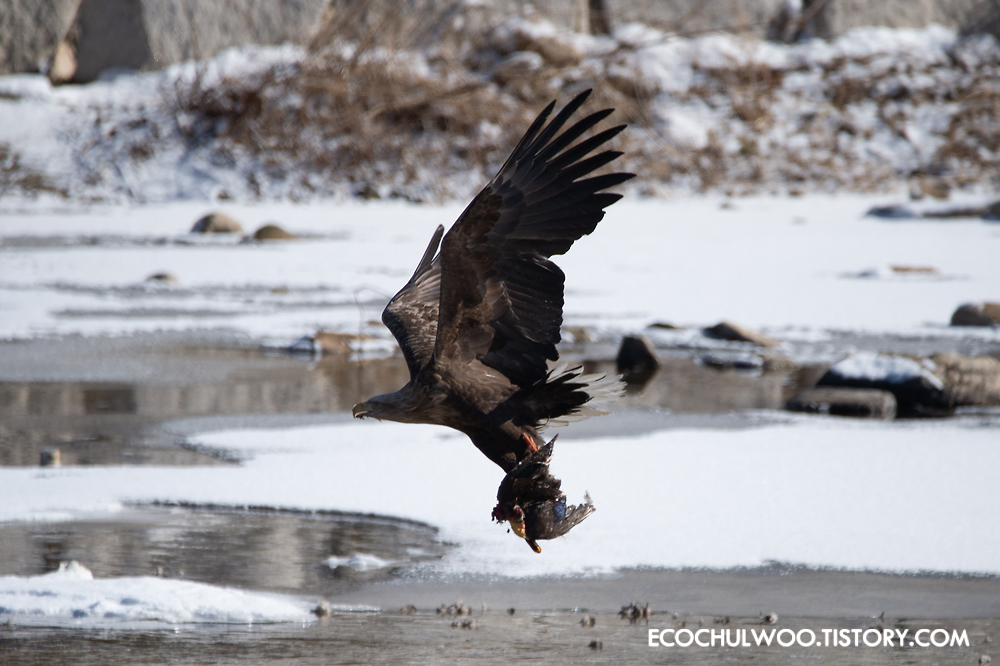 흰뺨검둥오리를 들고 날아오른다.